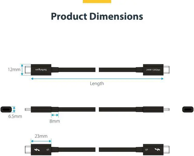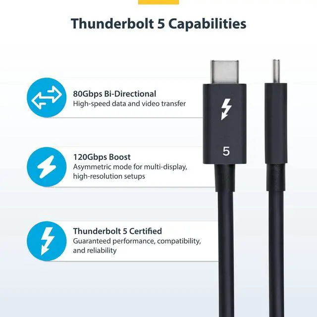 - SPECS: 0.5-meter (1.6-foot); Thunderbolt 5 (80Gbps with 120Gbps Boost); Supports Thunderbolt 4/3/USB4; DP 2.1 Alt Mode w/DSC/HDR/10-bit Color; Dual 8K 60Hz/4K 240Hz; PCIe 4.0 (64 Gbps); 240W PD EPR; 30/34 AWG Coaxial Wire; 0.18in (4.6mm) O.D.