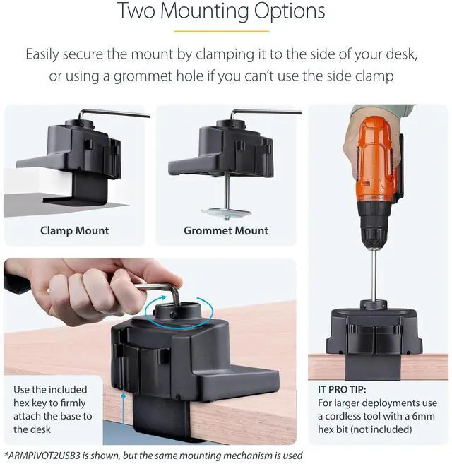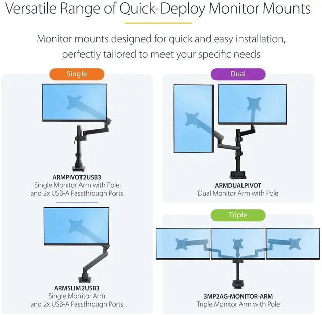 Easy InstallationThe VESA mount monitor stand is easy to install (desk C-clamp or grommet mount) and offers built-in cable management and dual USB 3.0 port passthrough for connecting your computer. The detachable VESA mount makes it simple to attach your monitor.
