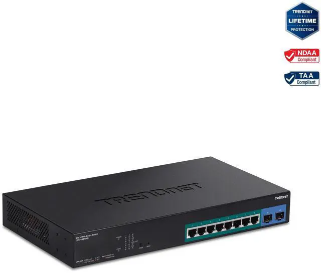 TRENDnet 10-Port Gigabit Web Smart PoE+ Switch with 8 Gigabit PoE+ Ports, 2 SFP Slots, 130W PoE Budget, VLAN, QoS, LACP, IPv4/IPv6 Static Routing,Lifetime Protection, Black, TPE-1021WS