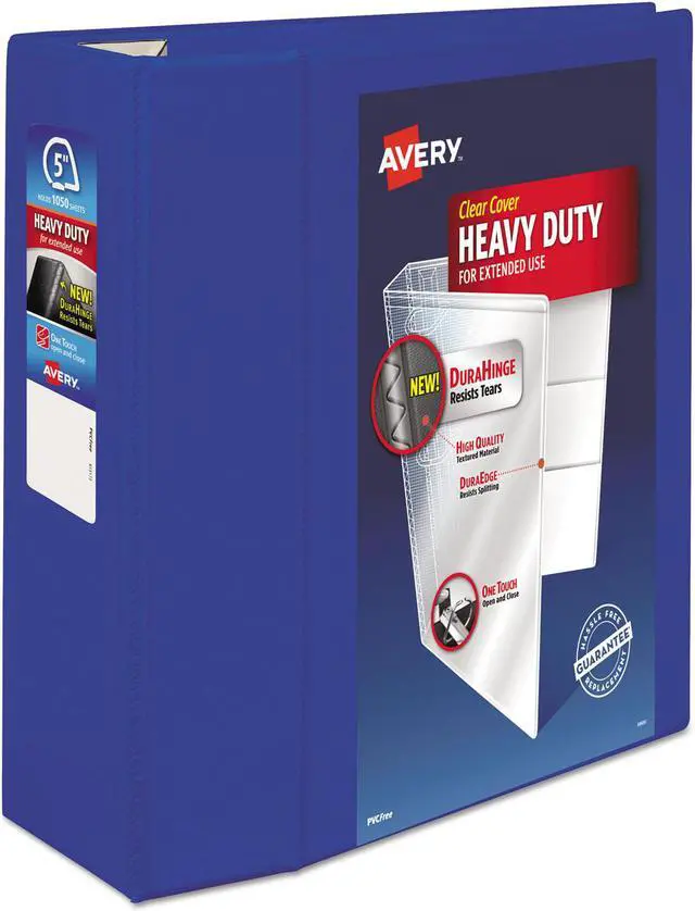 Heavy-Duty View Binder with One Touch rings is perfect for long-term, regular use. Tear-resistant DuraHinge design is stronger and lasts longer. DuraEdge feature makes the sides and top more pliable, providing greater split resistance. Deep-textured film offers a smoother finish and features a linen pattern for a high-quality look and feel. Clear cover and spine for easy customization. Four clear, interior pockets provide extra storage space. Wider front and back panels fully cover standard dividers and sheet protectors. EZD rings keep pages secure and have a higher page capacity when compared to the same size round rings. Customize the cover with free, easy-to-use templates and designs at Avery Design Print Online.