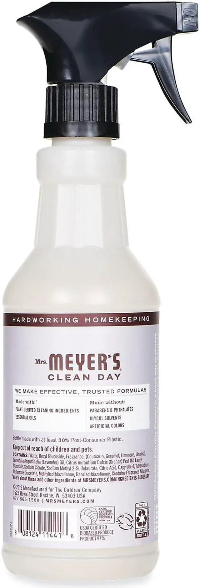 Mrs. Meyer's Multi Purpose Cleaner takes the basic formula of our All Purpose Cleaner and adds a special vegetable protein extract, a naturally fresh way of getting rid of kitchen messes and bathroom odors. Combines fresh scent with plant-derived ingredients and essential oils. Great on all non-porous surfaces such as finished wood and tile floors, countertops, walls, porcelain, bathroom fixtures, sealed natural and synthetic stone and more.