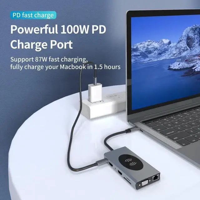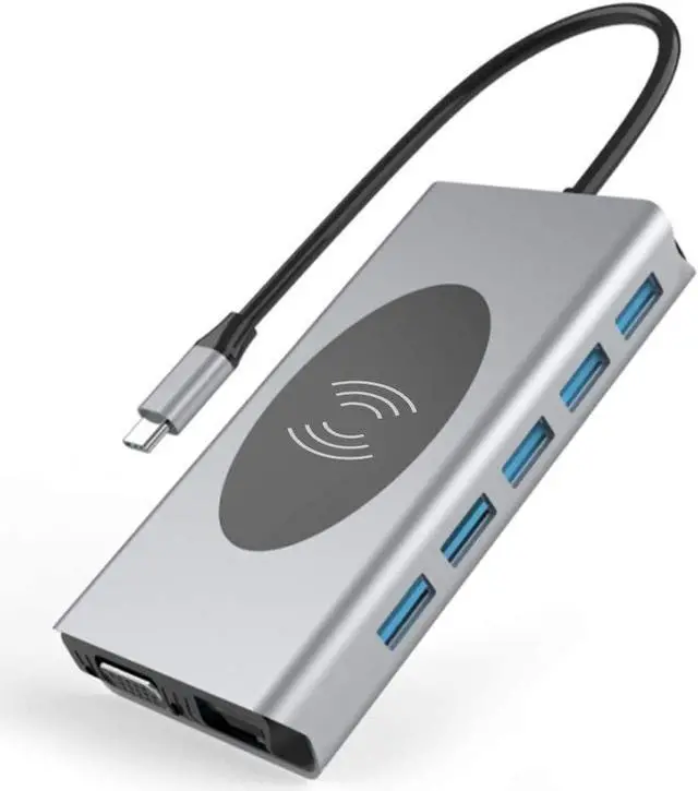 (14-in-1) USB C Hub, USB-C Docking Station, with Wireless Charger and 100W Power Delivery, 2x4K HDMI Port, 1 VGA Port 5 USB 3.0 Ports, 1 RJ45 Ethernet Port, SD/TF Card Reader, for Laptop PC and More