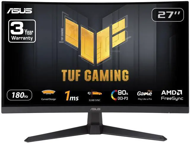 TUF Gaming VG27VQ3B Gaming Monitor - 27 inch Full HD, Curved, 180Hz, ELMB SYNC, FreeSync, 1ms response time, 90% DCI-P3, DisplayWidget Center 27-inch Full HD 1500R curved gaming monitor with ultra-fast 180Hz refresh rate designed for professional gamers and immersive gameplay 1ms (GTG) response time for smooth gameplay, and ASUS Extreme Low Motion Blur (ELMB ™ ) SYNC technology to further reduce ghosting and motion blur FreeSync delivers a seamless, tear-free gaming experience by enabling VRR (variable refresh rate) by default Shadow Boost enhances image details in dark areas, brightening scenes without over-exposing bright areasTUF Gaming VG27VQ3B is a 27-inch FHD (1920 x 1080) 1500R curved gaming monitor with an ultrafast 180 Hz refresh rate and 1 ms (GTG) response time for extremely immersive gameplay.