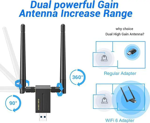 WiFi 6 USB Adapter has good signal receiving capabilities with dual 5dBi High gain Antenna,360° rotatable antenna provides a stronger wireless transmission and receives signals from any angle.Boost WIFI Coverage ensure stronger signal transmission and reception for a Smooth Surfing Experience.