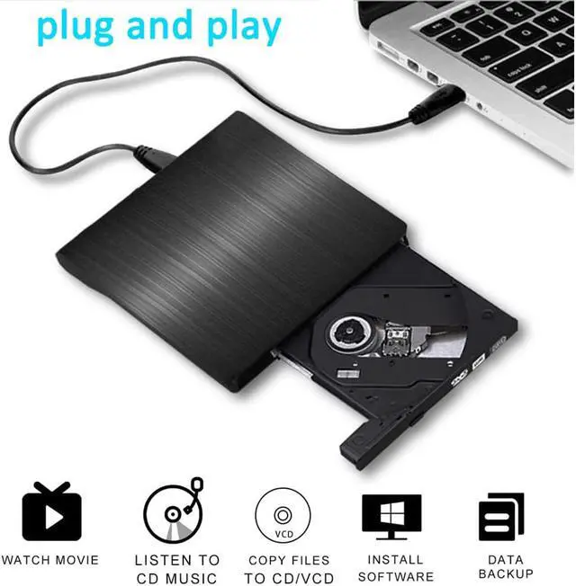 External DVD cd drive burner writer, allow you to watch DVD movies, burn files/music/movies to CD / DVD, install software and create backup discs etc.