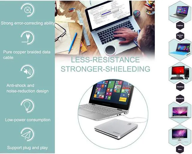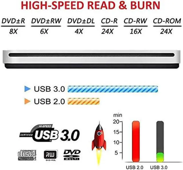1. Type C and Usb 3.0 superdrive provides faster data transfer speed, up to 10Gbps. It is backwards compatible with USB 3.0 /USB 2.0 /USB 1.0. 2. Made of all-Aluminum Alloy, unique configuration design, Easy to install, Plug and Play, No Any Driver Required (Excluded Windows 98SE). 3. The external cd burner supports to read CD, VCD, SVCD, CD-R, CD-RW, DVD-R/DVD-RW and write CD-RW, CD+RW, DVD-RW, DVD+RW etc.