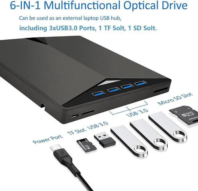 Upgraded External USB 3.0 /Type-C DVD Drive with 4 USB 3.0 Ports and 2 SD Card Slots, CD Burner DVD Player