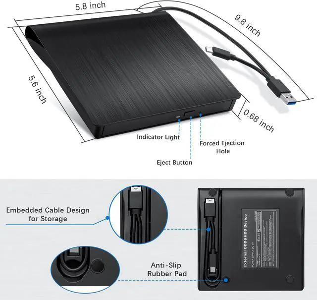 External DVD drive with embedded cable design, you do not worry about the loss of data cable. The length of the cable is approximately 25cm.