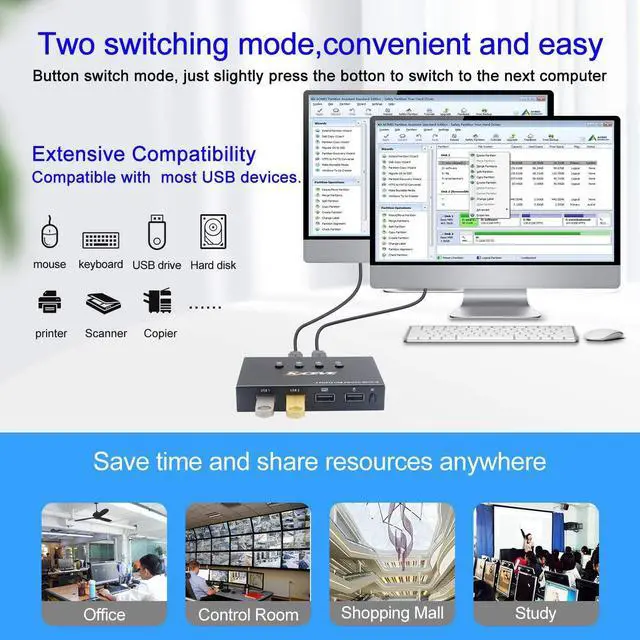 1, This USB 2.0 switch is for 4 computers to share 4 USB devices, such as mouse, keyboard, printer, scaner, hard drive, etc.