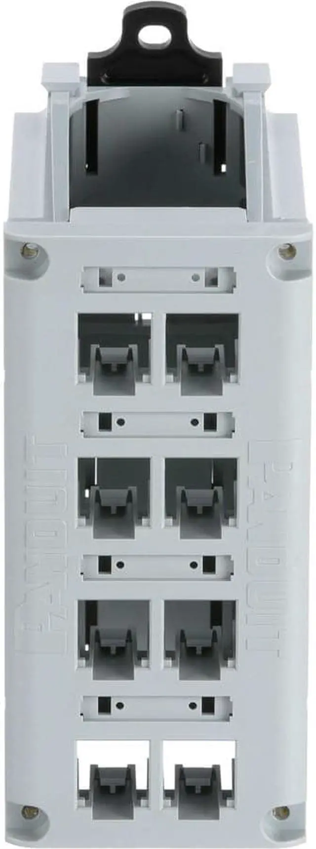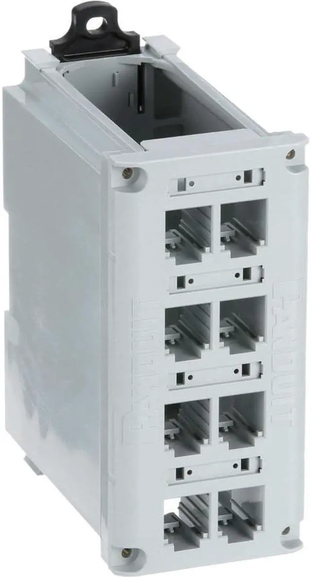The IndustrialNet (tm) Copper Shielded DIN Rail Patch Panel is constructed of high impact polycarbonate material. This 8-port DIN rail patch panel mounts to a standard 35mm DIN rail and includes adjustable latches to lock in in place. The Copper DIN Patch Panel can be used with any Mini-Com (r) Module that occupies a single space. This DIN rail patch panel includes screws to attach faceplate and Ultimate ID (r) Labels to identify each port, as well as clear label covers.