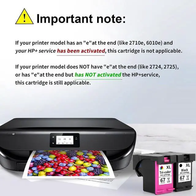 • [Important Note] - lf your printer model has an "e"at the end (like 2710e, 6010e) andyour HP+ service has been activated, this cartridge is not applicable. lf your printer model does NOT have "e"at the end (like 2724,2725),or has "e"at the end but has NOT activated the HP+service, this cartridge is still applicable.
