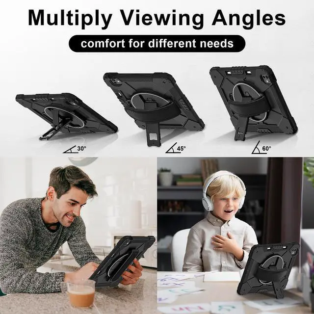 Built-in 360 Rotatable Kickstand + Hand Strap : 360-degree rotating swivel stand supports position of 3 angles(Vertical, Horizontal, and Halfway between), ideal for watching videos, conferences and travelling. Soft rotating handle strap prevents falling of tablet, featuring convenient use for school teachers, students, waiters, doctors, nurses and conference presenters.