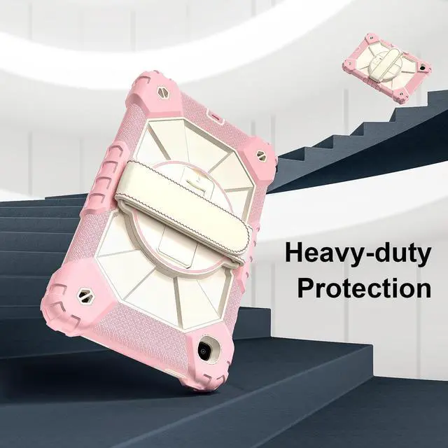 Built-in 360 Rotatable Kickstand + Hand Strap : 360-degree rotating swivel stand supports position of 3 angles(Vertical, Horizontal, and Halfway between), ideal for watching videos, conferences and travelling. Soft rotating handle strap prevents falling of tablet, featuring convenient use for school teachers, students, waiters, doctors, nurses and conference presenters.