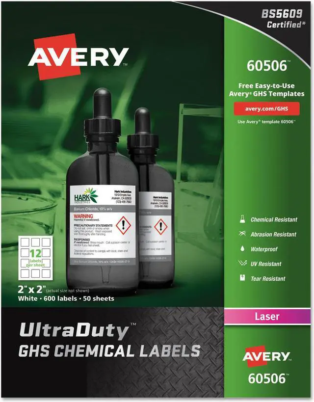Ensure your labels for chemical containers are compliant with the OSHA-mandated Globally Harmonized System (GHS), to avoid OSHA fines and create a safer work environment. Waterproof and resistant to chemicals, abrasion, sunlight, UV rays, tearing and harsh temperatures. High-performance adhesive passes the BS 5609 protocol for 90-day seawater immersion. Ideal for labeling drums, totes, pails, jugs and bottles. Also great for creating workplace safety labels for warning signs, arc flash, inspection and HazCom. Design and print GHS, HazMat and safety labels on demand using your printer and free Wizard software and templates at Avery? Design & Print / GHS. OSHA? is a registered trademark of Occupational Safety and Health Administration. Easy Peel? for fast peeling. Letter-sized, 8 1/2 x 11 sheets. Label Size - text: 2 x 2; Label Color(s): White; Machine Compatibility: Laser Printers; Sheet (W x L): 8 1/2 x 11.