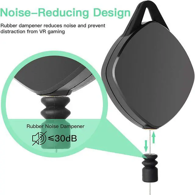 Specially designed rubber dampener and high-quality HMD cable minimize cable tug and noise during use, preventing distraction from your VR gaming. Retractable carabiners can extend 5 feet from the base station, ensuring you can walk freely in the play space.