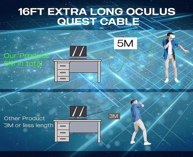 Play the best of both worlds with VR Link, stream games and playing PCVR. Use it to connect your PC to our all-in-one link headset. 16.4FT flexible, more playspace design empowers you to take on a wide range of games from the Rift library.