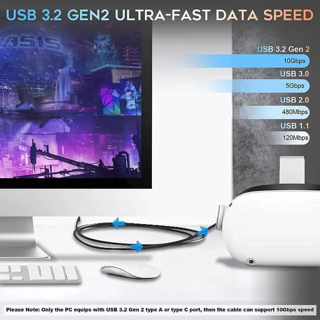 Features: High Speed Data Transfer USB 3.2 Gen 1 cable, transfer data to and from all your USB-C devices at speeds of up to 5 Gbps. No lag or delay when playing the game. 90 Degree Angle Unique 90 degrees L design, makes it doesn't stick out & is easy to use with the Quest VR headset. Reversible connector Reversible design, the cable connector can be inserted in the correct way every time. High quality Made of high-quality TPU material allows the cable to bend freely without breaking. Uses a 56K? pull-up resistor for incredible safety and reliability.