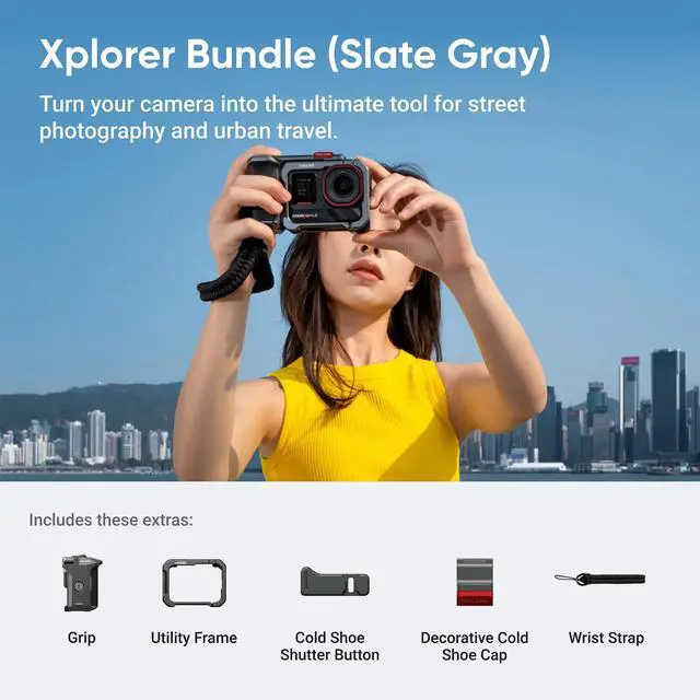 • XPLORER BUNDLE: Includes 1x Insta360 Ace Pro 2, 1x Wind Guard, 2x Batteries, 1x Standard Mount, 1x Mic Cap, 1x USB-C to USB-C Cable, 1x Grip, 1x Utility Frame, 1x Cold Shoe Shutter Button, 1x Decorative Cold Shoe Cap, 1x Wrist strap.