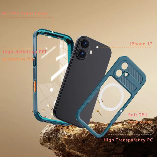 [Full Body Shockproof Protection] 360 Degree Full-body Rugged Dual layer Protection Case. Scratch resistant & Anti- falls provided by premium PC bumper and TPU materials, reduce shock and provide ultimate protection for your iPhone 17. Elevated bezels protect screen and camera lens avoid contacting with uneven surfaces and built-in screen protector in front cover for iPhone 17 waterproof case can provide you clear HD screen view without compromising screen touch sensitivity.