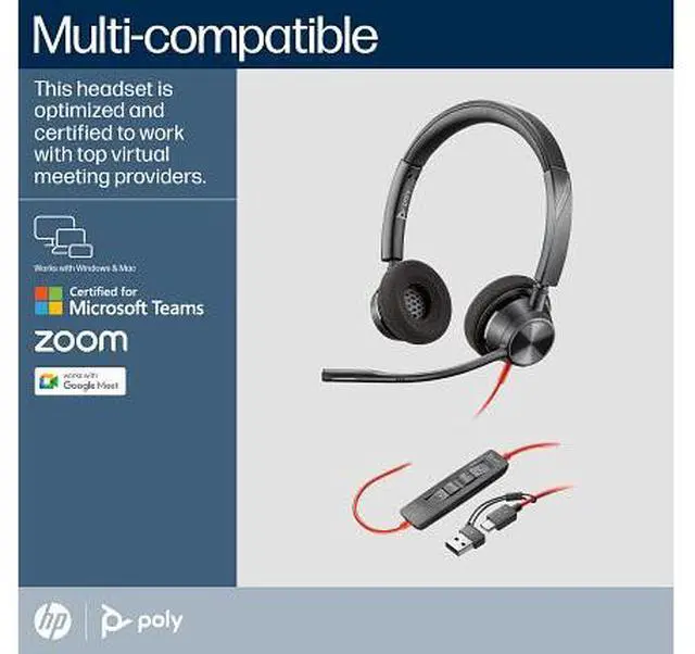 Style, comfort and audio qualityBuilt for style with a sleek design that focuses on comfort and reliability. Poly signature audio quality so you know you will sound great. And intuitive and simple features so every user can connect to their preferred device simply and easily. Connect quickly and easily The Blackwire 3300 Series is completely plug-n-play with USB devices, so users can take calls in the office or on the go. Its robust design delivers reliability you can count on. This is the hassle-free headset you've been looking for. Look good, feel good, sound amazing Boost your on-the-call confidence with professional-quality audio and a customized fit with a headset that can connect to your devices quickly and easily and is ready to go with you wherever you go.