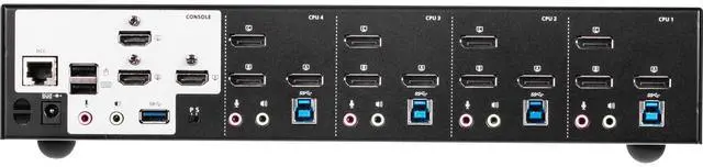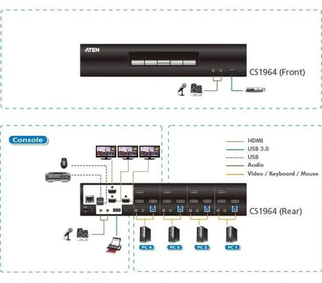 The ATEN CS1964 optimizes your desktop so you can effortlessly manage a triple-display multimedia workstation with instant, user-friendly access to four computers via a single USB keyboard, USB mouse and three HDMI monitors supporting resolutions up to 4K DCI (4096 x 2160 @ 60Hz).