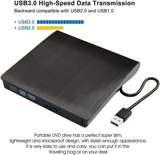 Ultra slim and portable CD/DVD drive with an embedded USB cable. The design makes the DVD writer/burner and USB cable are combined in one device, fashionable and scratch-proof. You can put it in the travelling bag or on your desk, which only needs a little space.