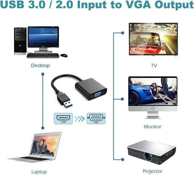 This USB 3.0 to VGA Adapter is used to connected a USB-enabled devices( such as laptop, desktop) with a VGA-enabled devices( such as monitor, projector, TV) for multi-monitor solution, extending working space with split-screen, mirroring display, etc