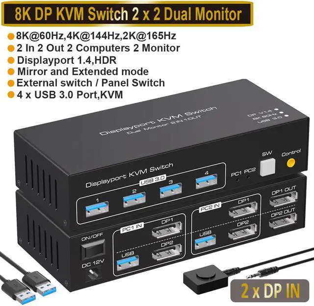 - Dual Monitor Displayport 1.4 KVM Switch can connect 2 computer hosts sharing 1 set of keyboard, mouse and 2 monitors.