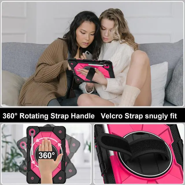 Built-in 360 Rotatable Kickstand + Hand Strap : 360-degree rotating swivel stand supports position of 3 angles(Vertical, Horizontal, and Halfway between), ideal for watching videos, conferences and travelling. Soft rotating handle strap prevents falling of tablet, featuring convenient use for school teachers, students, waiters, doctors, nurses and conference presenters.