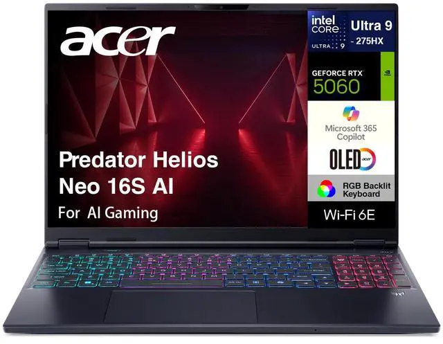Model: Acer Predator Helios Neo 16S AIForm/Style: StandardModel No: PHN16S-71-91AWProcessor: 15th Gen Ultra 9- 275HX 2.70GHz Processor (upto 5.4GHz, 36MB Cache, 24-Cores, 24-Threads, 8 Performance-cores)Memory: 16GB DDR5 SO-DIMMGraphics: NVIDIA GeForce RTX 5060 8GB GDDR7 Dual (Integrated+Dedicated) Graphics, Storage: 1TB PCIe SSD (Solid State Drive)Operating System: Windows 11 Home-64Display: 16.0" OLED WQXGA (2560x1600) 240Hz 16:10 DisplayConnectivity: Wi-Fi 6E AX211, Bluetooth 5.3, RJ-45Ports/Slots:, HDMI, 2 USB 3.2 Type-C, SD Card Reader, Headphone/Microphone Combo JackInput/Output: Webcam, Black, RGB KB Standard Keyboard, Battery: 230W PSU, 4-Cell 74 WHr BatteryOther Features, Color: Obsidian BlackWeight: 5.3lbProduct Dimensions (WxLxH): 11 IN x 15 IN x 1 IN