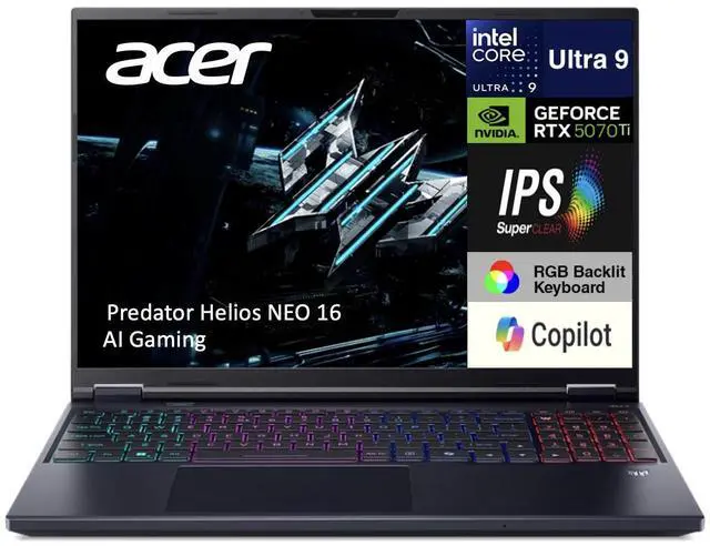 Model: Acer Predator Helios NEO 16 AIForm/Style: StandardModel No: PHN16-73-92X1Processor: 15th Gen Ultra 9- 275HX 2.70GHz Processor (upto 5.4GHz, 36MB Cache, 24-Cores, 24-Threads, 8 Performance-cores)Memory: 32GB DDR5 DDR5 SO-DIMMGraphics: GeForce RTX 5070 Ti 12GB GDDR7 Dual (Integrated+Dedicated) Graphics, Storage: 1TB PCIe SSD (Solid State Drive)Operating System: Windows 11 Home-64Display: 16.0" IPS WQXGA (2560x1600) 240Hz 16:10 DisplayConnectivity: 802.11ax Wifi, Bluetooth 5.3, RJ-45Ports/Slots:, HDMI, 2 USB 3.2 Type-C, SD Card Reader, Headphone/Microphone Combo JackInput/Output: Webcam, Black, RGB KB Standard Keyboard, Battery: 330W PSU, 2-Cell 90 WHr BatteryOther Features, Color: BlackWeight: 5.5lbProduct Dimensions (WxLxH): 10.9 IN x 14 IN x 1.3 IN