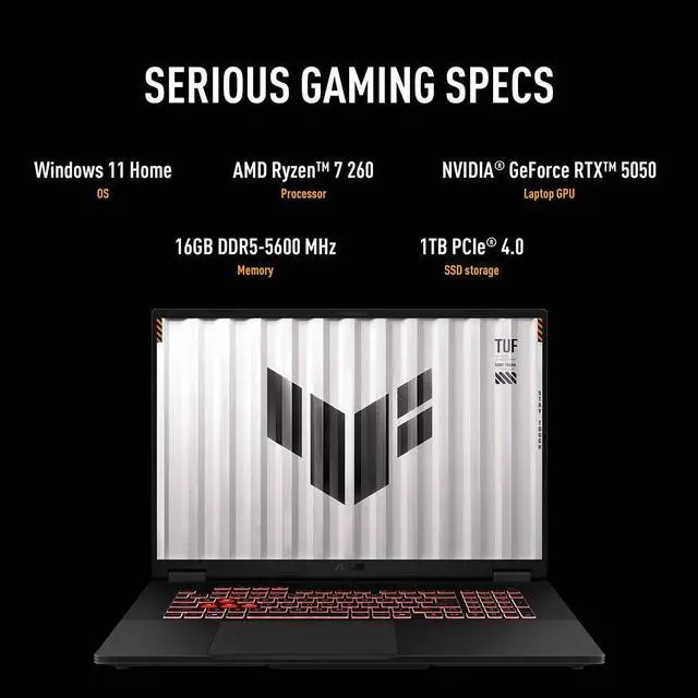DLSS 4 massively increases performance and improves image quality for top games using the power of AI.Game-Winning ResponsivenessNVIDIA Reflex 2 with Frame Warp gives you the ultimate responsiveness, enhancing target acquisition, reaction time, and aim precision.True-to-Life GraphicsExperience cinematic quality visuals at unprecedented speed with full ray tracing and breakthrough neural rendering technologies.Robust PerformanceEquipped with a AMD Ryzen 7 260 processor boasting 8 cores and 16 threads, the TUF Gaming A18 is a gaming monster. Whether you're gaming, streaming, or anything in between, the A18 has all of the horsepower you need to stay on top of the leaderboard.Help is always at handCopilot in Windows 11 complements your capabilities and creativity with intelligent assistance and relevant answers. Get time saving assistance - Summarize emails with Copilot in Windows 11 Get the answers you need - Get personalized guidance with Copilot in Windows 11 Control the settings you want - With Copilot in Windows 11Expand your PowerThe TUF Gaming A18 features 1TB of PCIe Gen 4 storage, plenty even for gamers with the largest libraries. With a total 16GB of high-speed DDR5 memory, everything from basic multi-tasking to demanding games will run smoothly. Best of all, both the storage and memory are fully accessible and upgradeable, giving you flexibility for the future.All-new DesignThe very first 18-inch laptop in the TUF Gaming family, the A18 is packed with killer features that take full advantage of that extra space. Featuring a 16:10 aspect ratio WUXGA resolution display, a full keyboard with a built-in numpad, an extra-large trackpad, and a 90Wh battery, the TUF Gaming A18 is the perfect mobile battlestation, all in one package.