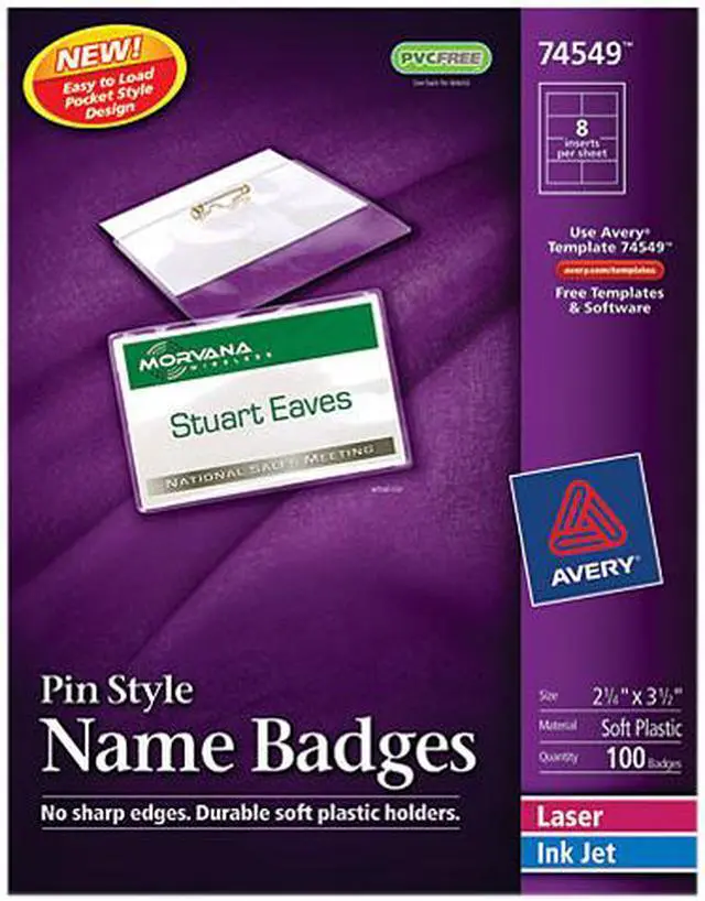 These badges feature a durable, easy-to-load, open top, pocket-style design. White micro-perforated name badge inserts are printable on both sides and separate cleanly leaving smooth edges. Create badges with text and colorful graphics using free designs and templates with Avery