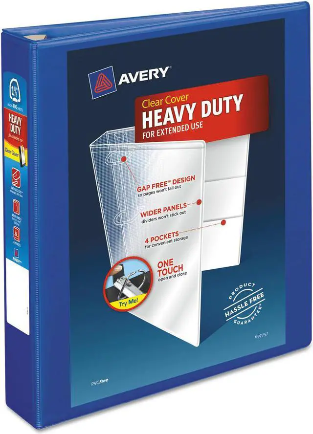 Heavy-Duty view binder with one touch EZD rings is perfect for long-term, regular use. Tear-resistant DuraHinge design is stronger and lasts longer. DuraEdge feature makes the sides and top more pliable, providing greater split resistance. Deep-textured film offers a smoother finish and features a linen pattern for a high-quality look and feel. Clear cover and spine for easy customization. Four clear, interior pockets provide extra storage space. Wider front and back panels fully cover standard dividers and sheet protectors. One touch EZD rings provide easy access and have a higher page capacity when compared to the same size round rings. Customize the cover with free, easy-to-use templates and designs at Avery Design & Print online. Binder Type: Ring; Binder Style: View; Binder Size Capacity: 1.5"; Binder Sheet Capacity: 400.