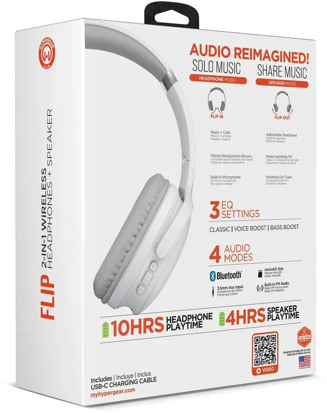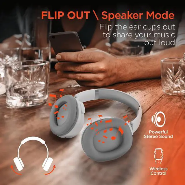 Two ways to play, one seamless experience. The Flip 2-in-1 Wireless Headphones + Speaker from HyperGear gives you total control over your portable audio, wherever you go. Flip the ear cups inward to activate Headphone Mode, where plush memory foam cushions provide a snug, noise-isolating fit for immersive solo listening. Flip them outward to switch to Speaker Mode, instantly amplifying the sound so you can share your music in full stereo. Powered by 40mm neodymium drivers, these headphones deliver HD-quality audio, while three EQ modes let you fine-tune your sound with the press of a button.