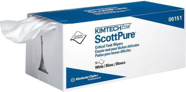 Kimtech Prep SCOTTPURE Critical Task Wipers have excellent absorbency and are really low-lint. The special rayon/polyester spunlace material is solvent-resistant and have no binders or surfactants. These white wipers work well in aerospace, clean manufacturing areas and DVD making and printing. They are designed for critical tasks where precision and reliability are important. Global Product Type - Towels & Wipes-Delicate Task Wipe Towel/Wipe Type - Delicate Task Wipe Application - Delicate Surfaces Application - General Purpose, Industrial Application - Warehouse Applicable Material - Multiple Material(s) - Rayon/Polyester Number of Plies - 1 Color(s) - White Scent - Unscented Length - 23 Width - 12 Packaging - Box Number of Towels/Wipes Per Container - 50 Pre-Consumer Recycled Content Percent - 0% Post-Consumer Recycled Content Percent - 0% Total Recycled Content Percent - 0%