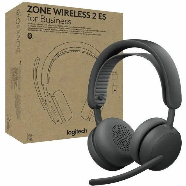 Logitech Zone Wireless 2 ES for Business - Noise-Canceling Wireless Headset with Adaptive Hybrid ANC (Graphite, UC version, with receiver)