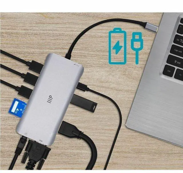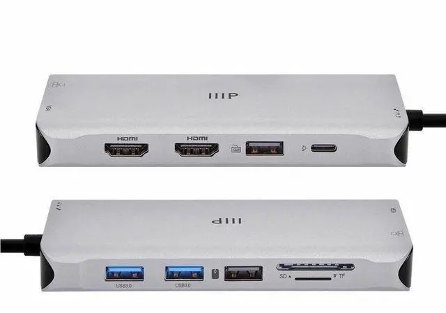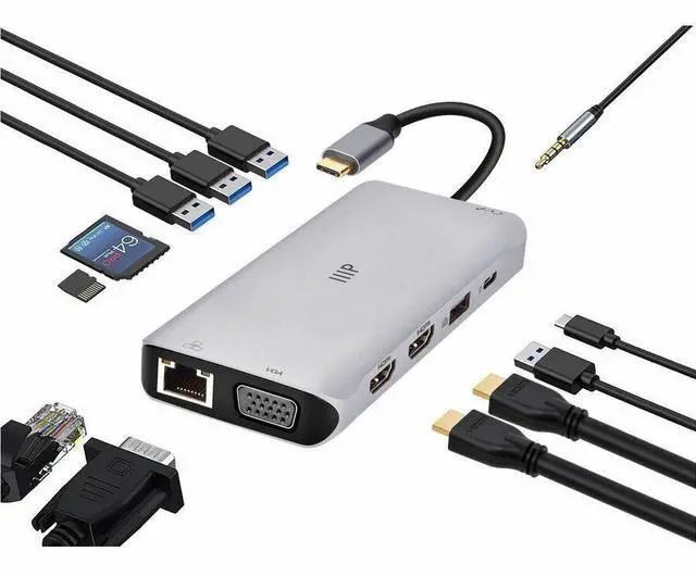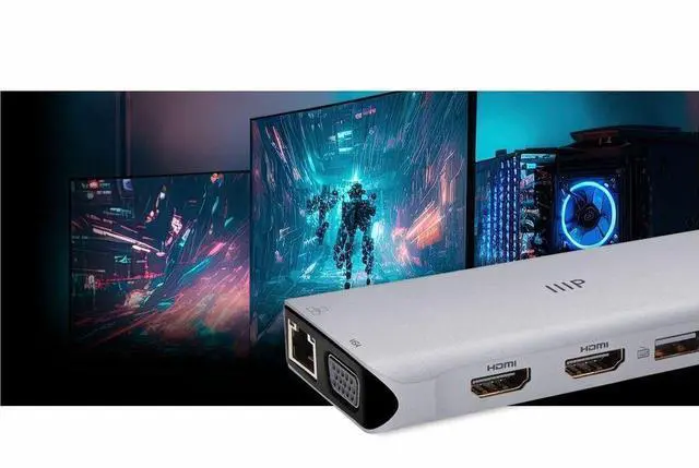The Monoprice 12-in-1 Dual-HDMI + VGA Universal Triple Display Dock is a compact yet powerful solution to all your workplace setup needs. It extends just one USB-C (with DP 1.4 or DP 1.2 mode) or Thunderbolt port into 14 ports, including two 4K HDMI and one 1080p VGA display, 4 high-speed USB-A data ports, Gigabit Ethernet port, simultaneous SD/MicroSD card readers (104Mb/s), 3.5 mm 2-in-1 audio/mic port, and a USB-C port for 100W Power Delivery pass-through charging. Just plug in your devices and start using no driver or special setup is necessary.