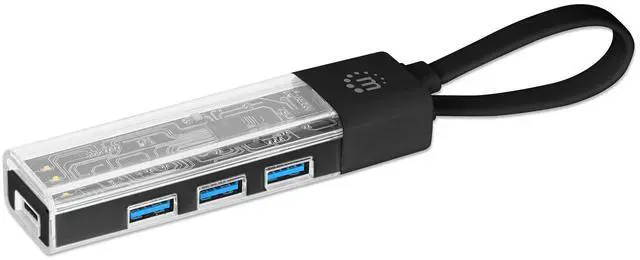 Adds four USB-A ports to connect mice, keyboards, flash drives and more or to charge and sync mobile devices || USB 3.2 Gen 1 (formerly USB 3.0) Type-A ports with SuperSpeed transfer rates up to 5 Gbps and charging up to 4.5 W (5 V / 0.9 A) || Detachable, flat 18 cm (7 in.) USB-A to USB-C cable, can be used as regular sync/charging cable or as carry loop for the hub || Transparent housing showcases the components combining visual appeal and functionality on your desk || Bus powered: no external power supply needed || Compatible with Windows, macOS, Linux, and Chrome OS || Great for desktop PCs, Ultrabooks, laptops, Chromebooks, MacBooks, Surface devices and more || Plug-and-play installation; no configuration or drivers required || Backward compatible with USB 2.0 and USB 1.1 || Supports Hot Swapping || Portable, compact, lightweight design that easily fits into laptop bag pockets || Three-year warranty