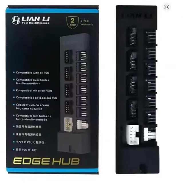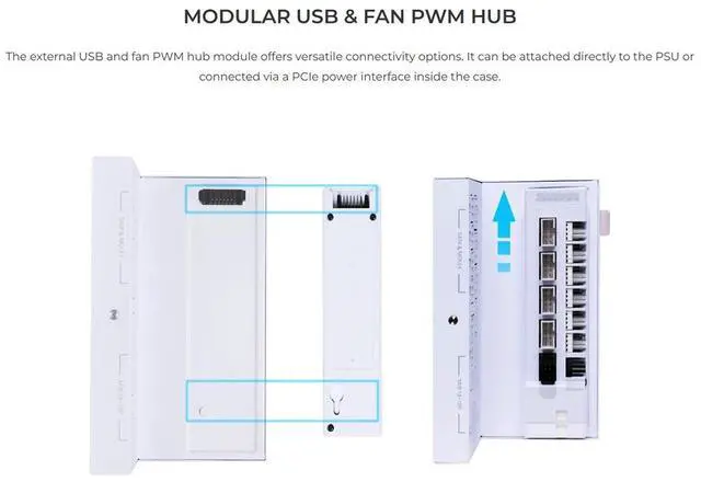 The external USB and fan PWM hub module offers versatile connectivity options. It can be attached directly to the PSU or connected via a PCIe power interface inside the case.