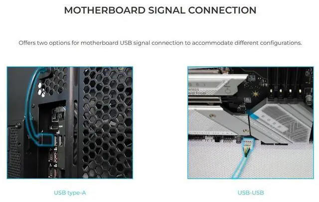 Offers two options for motherboard USB signal connection to accommodate different configurations.