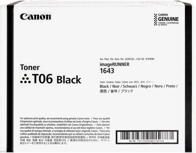Canon T06 Original Toner Cartridge - Black - Laser - 20500 Pages - 1 Each Toner cartridge delivers consistent performance in your Canon imageRunner 1643i and 1643iF. Toner meets high-quality output. Easy-to-install cartridge saves time and boosts productivity. It yields approximately 20, 500 pages at 5 percent coverage.