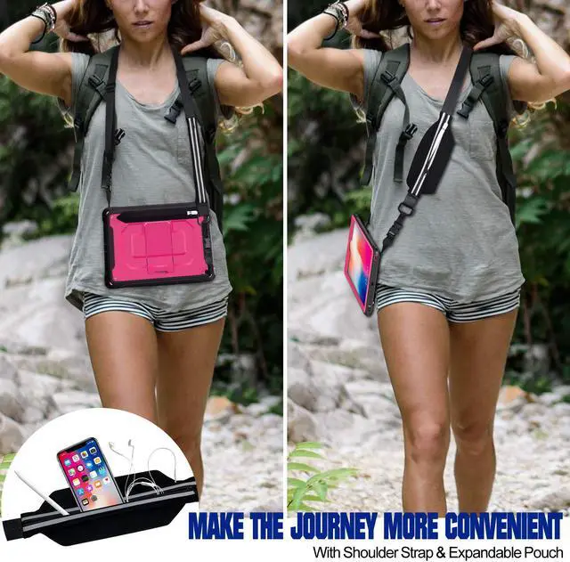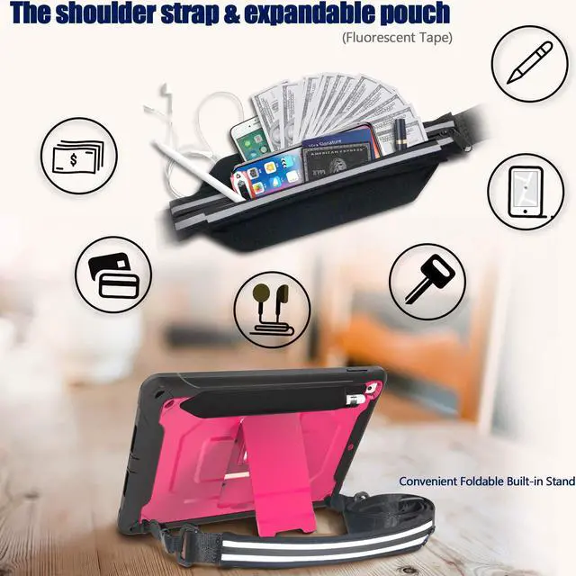 Convenient Carrying Strap: Adjustable Shoulder Strap allows to carry your iPad in landscape/portrait mode securely in outdoors or hang your iPad in kitchen, bedroom, car seat for convenient usage. Besides, A Expandable Storage Pouch on strap allow for carrying all essential items including keys, earphones, cash, ID, credit cards, and a smart phone up to 6.5" 9.7 iPad Case with Pencil Holder and