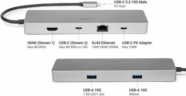 Rocstor's USB-C 6-in-1 Dual Display Multiport Portable Adapter is a compact and powerful solution designed to enhance the connectivity options of Type-C or Thunderbolt hosts, including PCs, laptops, and mobile phones. This versatile dock features an HDMI port, a Type-C video port with 10G capabilities, two USB-A 10G ports, Gigabit Ethernet, and a Type-C PD charging port, making it particularly useful for devices with a single Type-C port. With DisplayPort 1.4 Alt mode supported IC, this dock can output a maximum single 8K@30Hz or dual 4K@30Hz videos, while the Type-C video port also facilitates USB 3.2 data transfer at speeds up to 10Gbps.