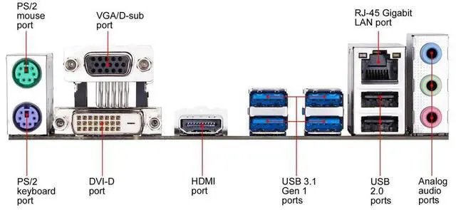 1x PS/2 keyboard port; 1x PS/2 mouse port; 1x D-Sub port; 1x DVI-D port; 1x HDMI port; 4x USB 3.1 Gen 1 ports; 2x USB 2.0 / 1.1 ports; 1x RJ-45 port; 3x audio jacks (Line In, Line Out, Mic In).