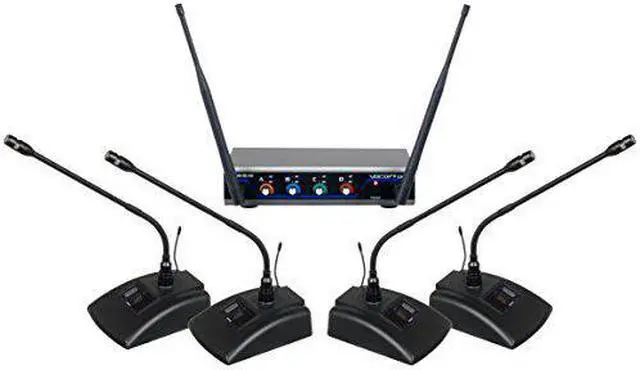 VocoPro's DigitalQuad-Conference is a digital wireless conference microphone system using Mic-On-Chiptechnology making it super affordable and simple to use. Combine up to 4 individual frequency sets (additional purchase required) to accommodate 16 personnel. the turn-key system requires no syncing or setting up. Its super quiet 24 bit digital transmission is also digitally encrypted to keep the content of meetings both private and secure.