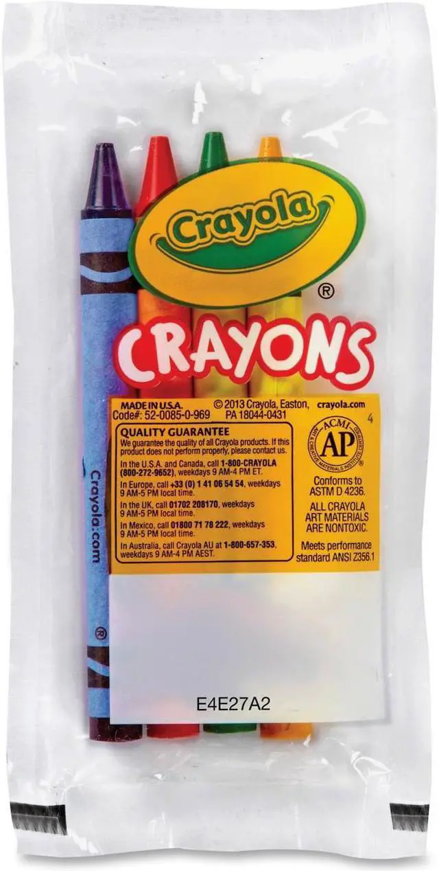 Sets of four crayons offer a great diversion and provide hours of coloring fun. They are perfect for children 4 and over at special events. Regular-size crayons come in a plastic pouch for easy access. Each pouch includes one each of red, yellow, green and blue. Permanent, waterproof crayons are certified AP nontoxic and conform to ASTM D-4236.
