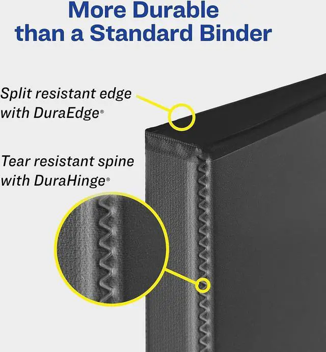 Avery Heavy Duty View Binder features a DuraHinge design that's stronger, lasts longer and resists tearing, and DuraEdge that makes the sides and top more pliable to resist splitting.