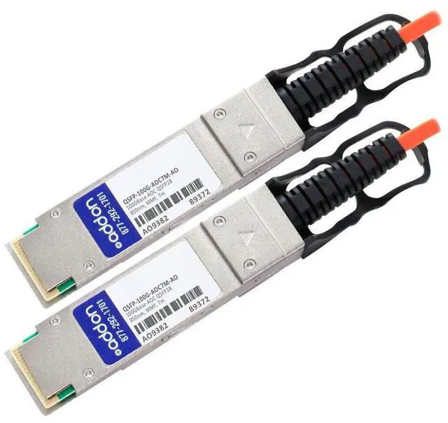 Introducing the Add On QSFP-100G-AOC7M-AO, a high-quality computer component designed to enhance your device's performance. This optical cable, measuring 12.7 cm in length, is equipped with SFP connectors, providing a reliable and secure connection between your devices. The cable is programmed, uniquely serialized, and data-traffic and application tested to ensure it is 100% compliant and functional. The Add On QSFP-100G-AOC7M-AO is compatible with PCs and is designed for both indoor and outdoor usage. The cable is braided, providing added durability and protection. With a data transfer rate of 100 Gigabits per second, this cable ensures fast and efficient data transfer. The package includes one cable, and it is shipped in a protective package for safe handling. Please note that the item weight is 1.5 ounces and it is red in color.