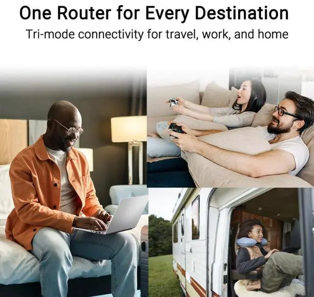 • Tri-mode connectivity for travel, work and home with 4G/5G mobile tethering, a private hotspot over public WiFi (WISP mode), and router mode.